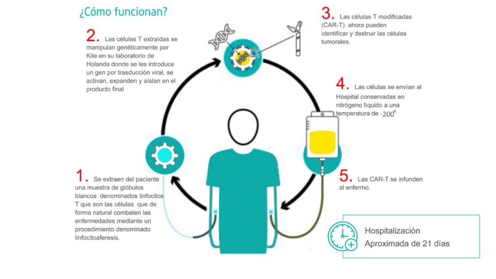 «La terapia CAR-T Cell consiste en la extracción de linfocitos T del paciente mediante aféresis y su manipulación genética en laboratorio con una trasducción viral para que expresen un receptor concreto (receptor antigénico quimérico) que va dirigido contra un antígeno de la célula tumoral. Tras esta manipulación se infunde al paciente».
