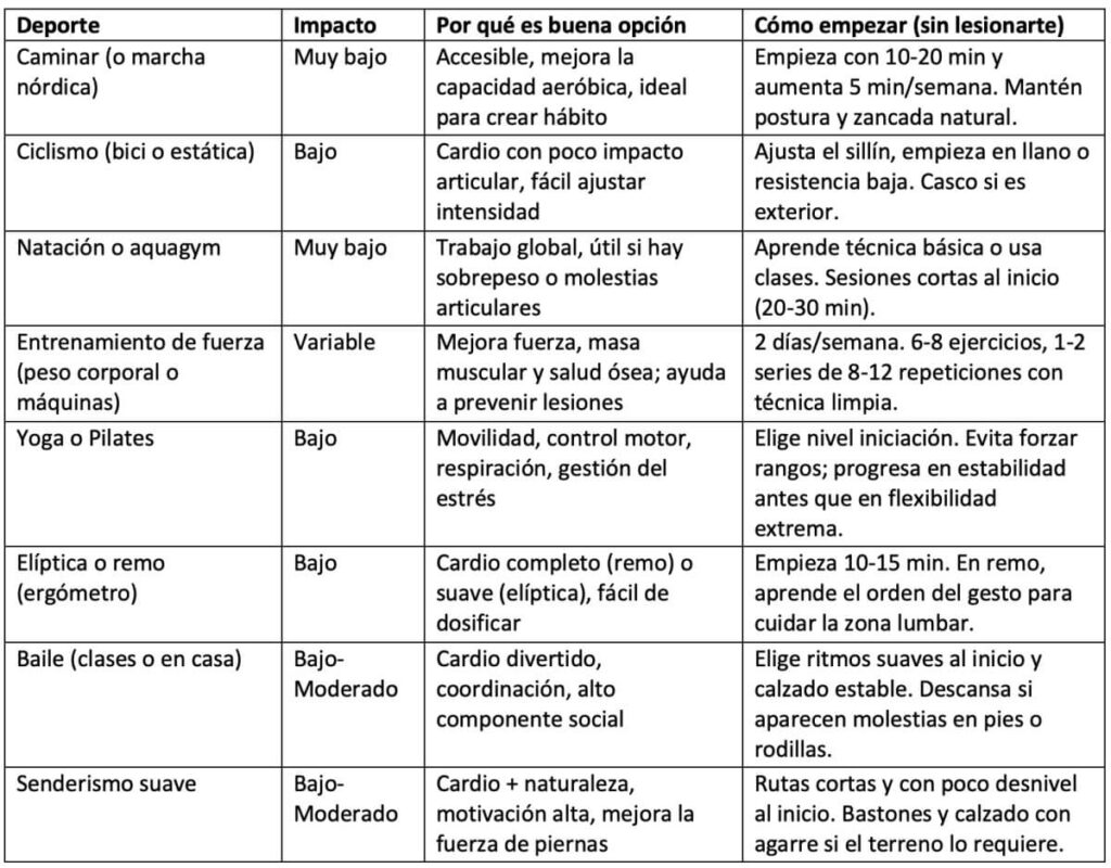 No existe el deporte perfecto, pero sí opciones más «amables» para empezar, con menor impacto y mayor facilidad para regular la intensidad. A continuación tienes una guía práctica.