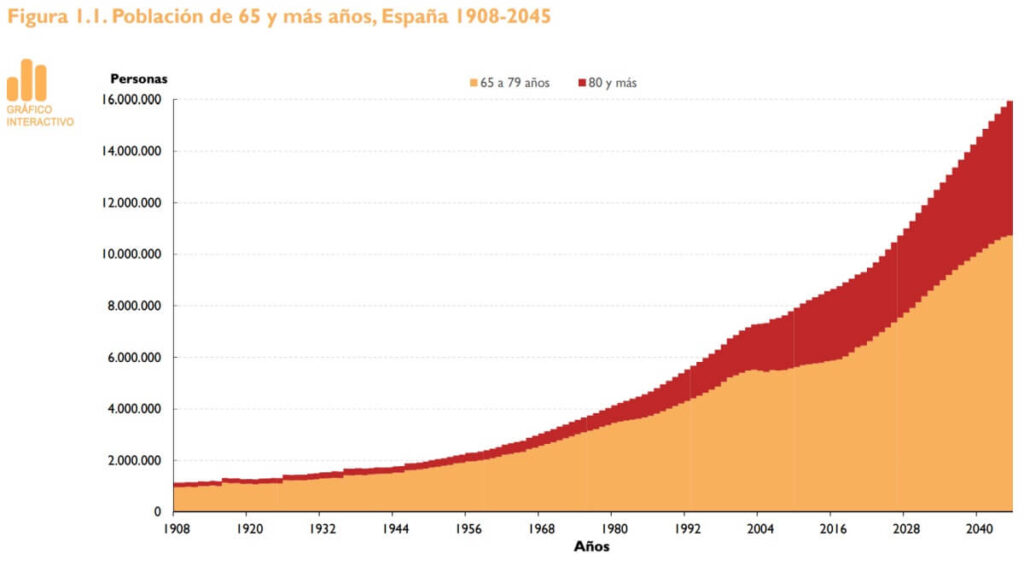 España se enfrenta a los retos del envejecimiento de la población. en 2045 la población mayor podría superar los 15,9 millones, lo que equivaldría al 29,2% del total de habitantes.